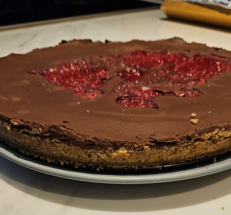 - Zet de taart voor minimaal 4 uur in de koelkast. Top de volgende dag af met verse frambozen en eventueel wat kokosrasp. Genieten maar!
